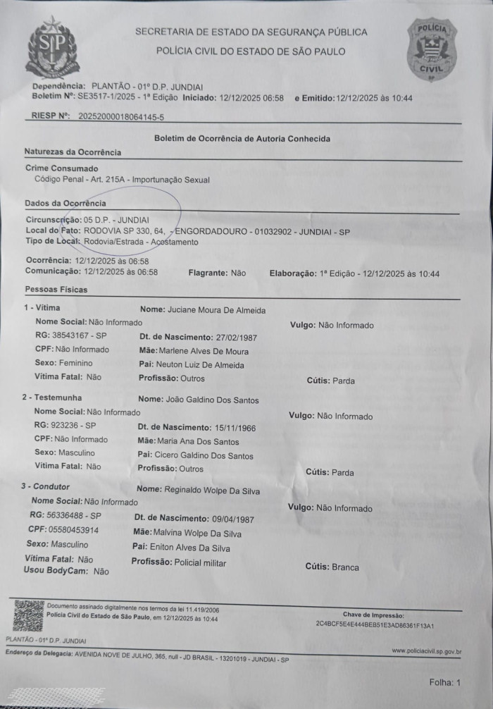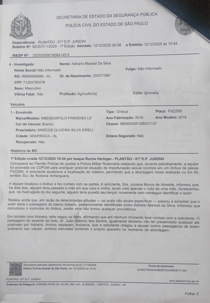O relato da vítima detalha que a situação se agravou no momento da abordagem policial. Segundo o BO, após a chegada da polícia, o suspeito, Adriano, ao negar os fatos, teria tentado desmerecer a vítima. O documento registra que ele declarou que a passageira estava "chegando a acusar outros passageiros de terem subtraído seu celular", uma alegação que Juciane prontamente negou, afirmando que o aparelho estava com ela.